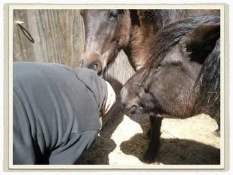 PonyPestosis -Newfoundland Ponies prefer to hang out with you than do anything else. While hanging out with you, they will include you in their group-grooming session, nuzzling each other and you without hurting or stepping on you. They'll also walk off with anything you have or are using: tools, jackets, brushes, tarps, and the hat right off of your head.